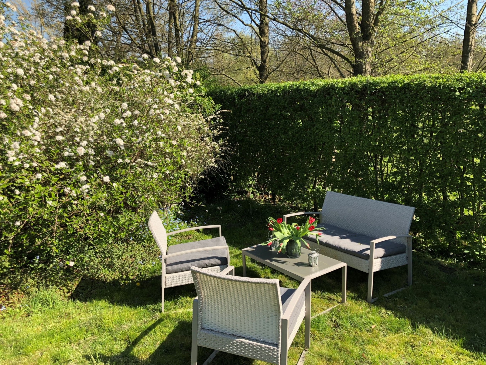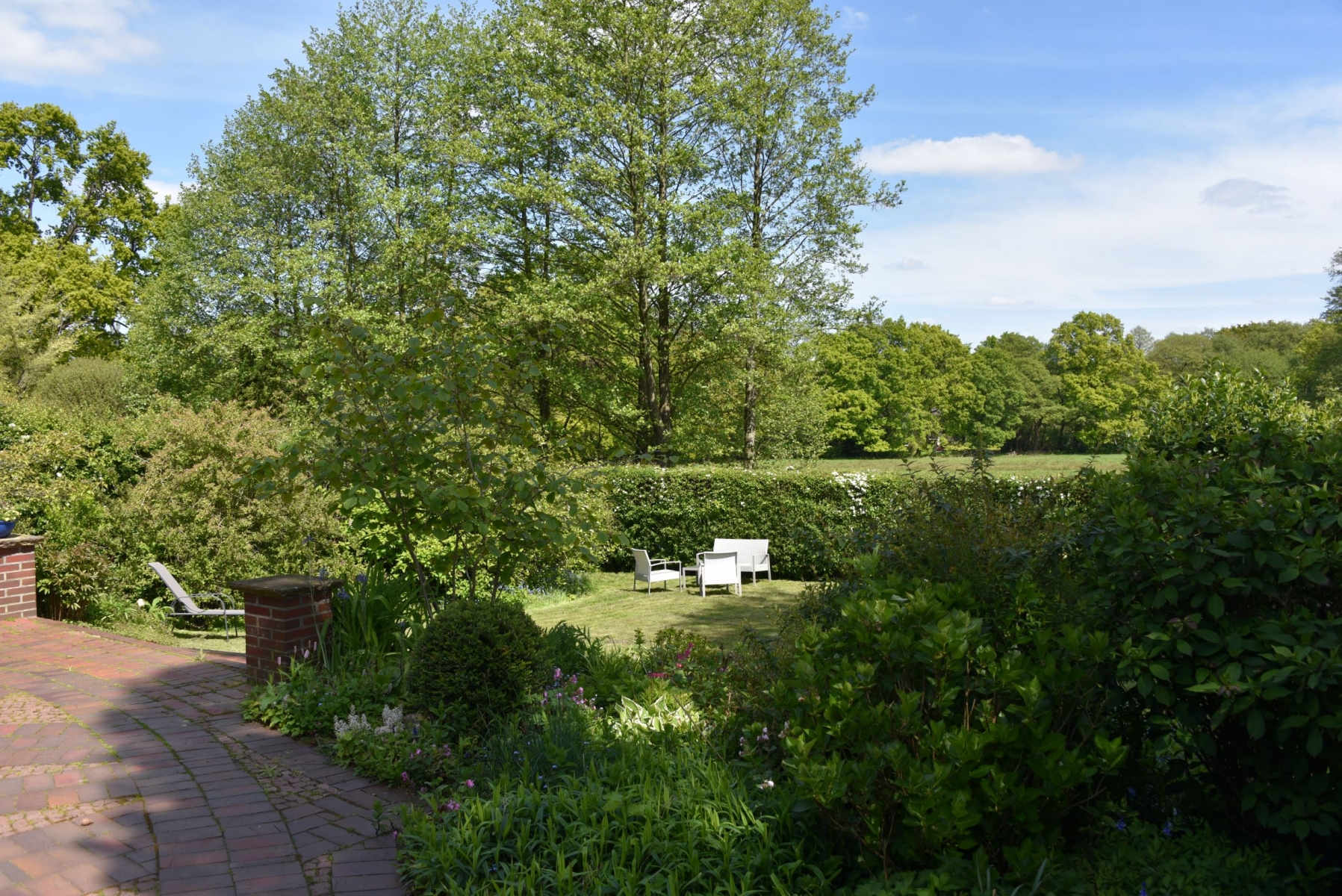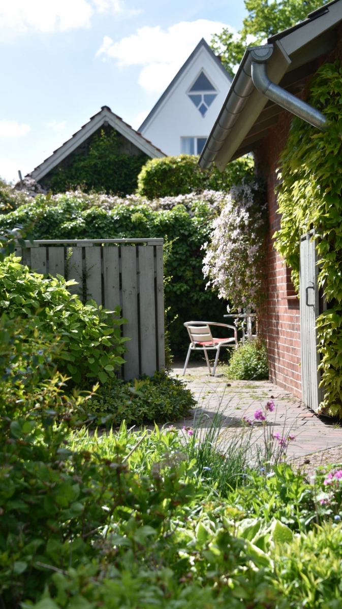 Das Ferienhaus liegt in der 2. Reihe, so dass sich trotz der zentralen Lage eine private Oase eröffnet. Der Garten, die Sonnenterrasse, ein Windgeschützter und sonniger Innenhof, ein Fahrradschuppen und der Carport gehören zum Haus und bieten ungestörte Rückzugsmöglichkeiten. An den Garten schließt ein Landschaftsschutzgebiet an: den ungestörten, weiten Blick dort hinaus kann man vom Garten, der Terrasse, dem Wohnraum und vom Schlafzimmer im 1. Stock aus genießen.